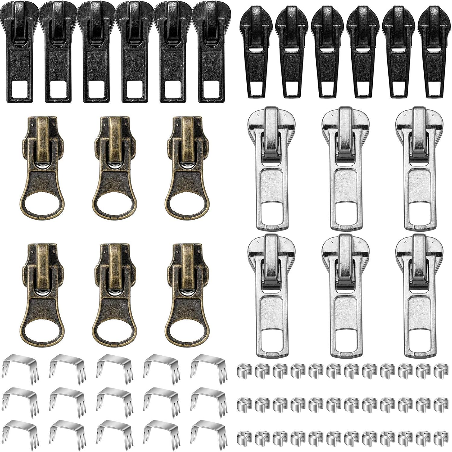 Quantity of Package there are 24 pieces zipper sliders in our package, including 6 x # 5 silver sliders with locks, 6 x # 5 black sliders with locks, suitable for size 5 resin zippers, 6 x # 5 bronze slider with lock, suitable for No; 5 metal zipper, 6 x # 7 black slider with lock, suitable for size 7 nylon zipper, also provide you 15 pieces bottom stops and 30 top stops, total 69 items, the sufficient quantities and styles will meet your various needs in daily life